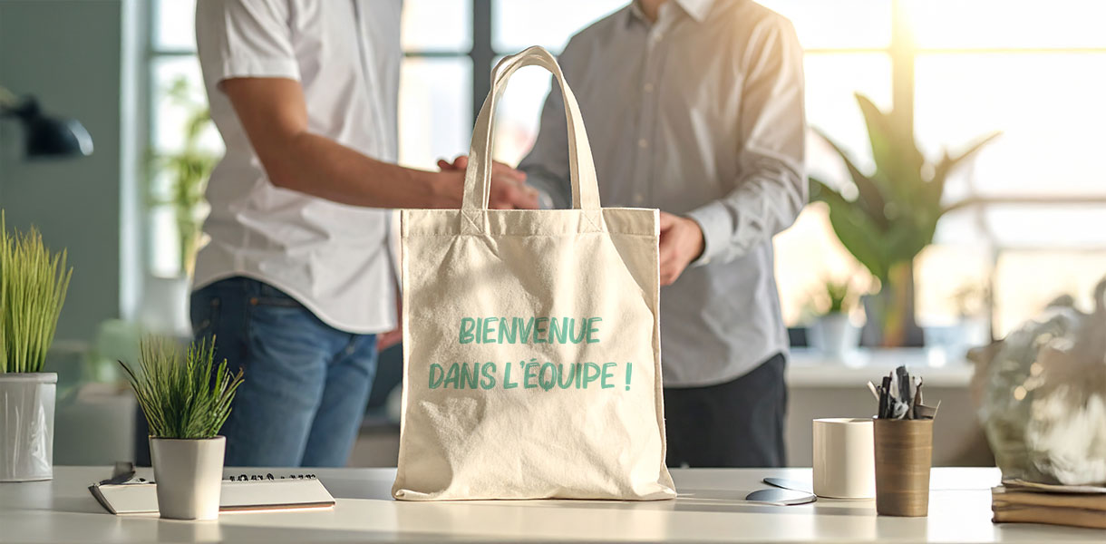 Un tote bag d’entreprise personnalisé, posé sur le bureau d’accueil d’un nouvel employé, mettant en avant le kit d’onboarding et les engagements RSE.